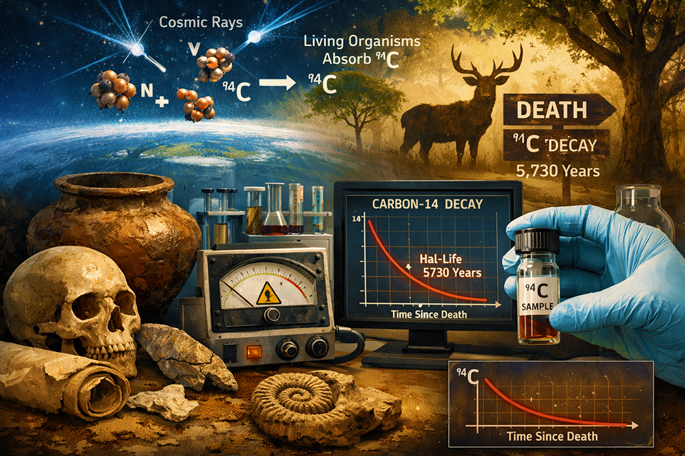 Carbon dating, also known as radiocarbon dating, is a scientific method used to determine the age of once-living materials such as wood, bone, cloth, and charcoal. It is based on the radioactive isotope carbon-14 (¹⁴C), which forms in the upper atmosphere when cosmic rays interact with nitrogen. Living organisms continuously absorb carbon, including a small amount of carbon-14, through processes like breathing and eating. However, when an organism dies, it stops taking in carbon, and the carbon-14 it contains begins to decay at a known rate, with a half-life of about 5,730 years. By measuring the remaining amount of carbon-14 in a sample and comparing it to the expected original level, scientists can estimate how long it has been since the organism died. Carbon dating has revolutionized archaeology, paleontology, and environmental science, helping researchers date ancient artifacts, fossils, and historical objects up to around 50,000 years old with remarkable accuracy.