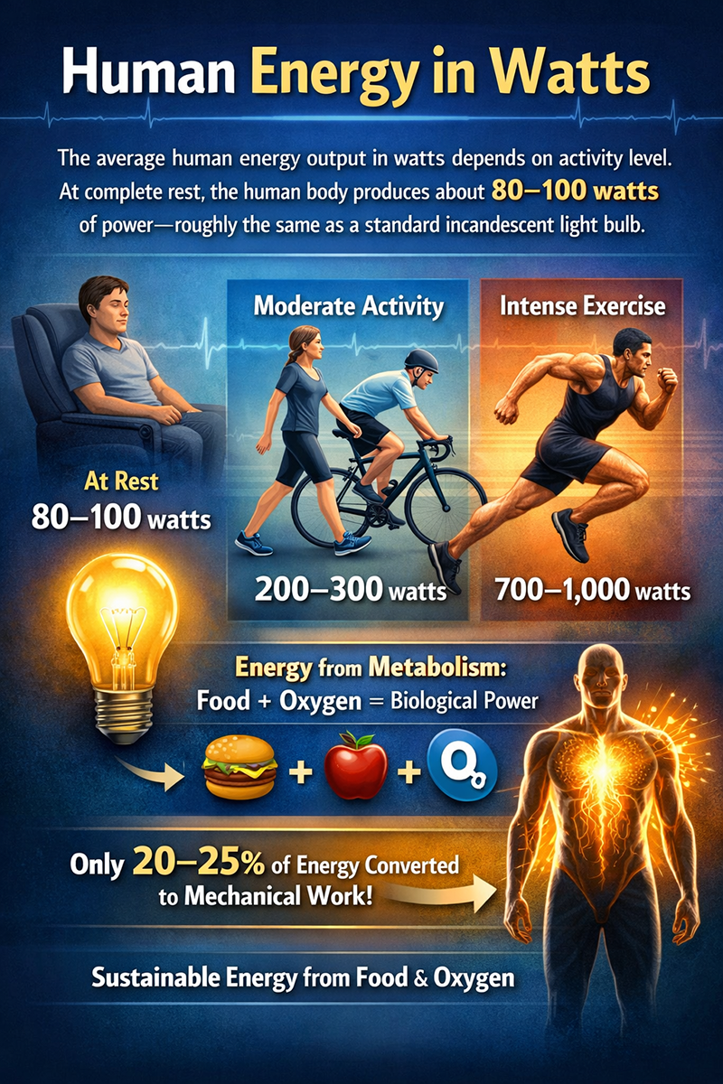 The average human energy output in watts depends on activity level. At complete rest, the human body produces about 80–100 watts of power. Roughly the same as a standard incandescent light bulb. This energy comes from metabolism, where food is converted into usable biological energy to keep the heart beating, lungs breathing, brain functioning, and body temperature stable. During moderate activities like walking, power output can rise to 200–300 watts, while intense physical effort such as sprinting or cycling can briefly exceed 700–1,000 watts in trained individuals. Even though humans are not highly efficient mechanical machines (only about 20–25% of metabolic energy converts to mechanical work), our continuous energy production makes us remarkably sustainable biological systems powered simply by food and oxygen.