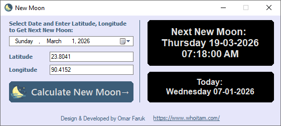 New Moon Omar Uncategorized Comments New Moon computes the next new moon after a given date and shows the event time in local time at the supplied latitude and longitude. Download