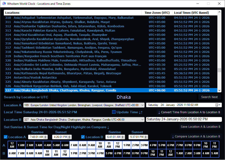 It contains all time zones along with their UTC offsets. Time zones can be searched by location name or by UTC offset. Using the index number, a time zone can be selected in both the Location A and Location B combo boxes. For any given time in Location A, the application can calculate the corresponding time in Location B. The local times of both locations can then be compared in terms of day and night. To enable this comparison, the sunrise and sunset times for Location A and Location B must be provided.